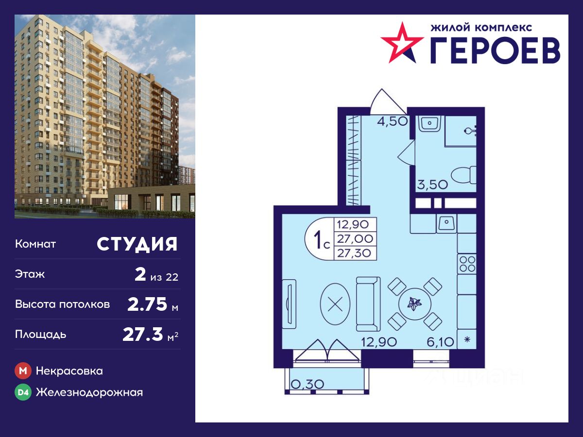 Продаётся студия в строящемся доме (Корпус 410), срок сдачи: I-кв. 2027, общей площадью 27.3 кв.м., на 3 этаже. ЖК ''Героев'' возводится в центре г.о. Балашиха, в мкрн Железнодорожный. Проект представляет собой 4 квартала монолитно-кирпичных домов комфорт-класса. Предлагаются студии, 1-, 2- и 3-комнатные квартиры с готовой отделкой, планировки - евро и классика. На территории построят детские сады и школы. В центральной части застройки оборудуют зоны для спорта и командных спортивных игр, велодорожки, детские игровые площадки и сквер с местами для отдыха. На первых этажах жилых корпусов будут магазины, банки, кафе и другие предприятия сферы услуг и торговли. Возле домов организуют авто- и велопарковки. В пешей доступности находится обширная зелёная зона - Ольгинский лесопарк, а также обжитые районы с развитой инфраструктурой, где работают детские сады и гимназии, поликлиники и ТЦ, школа искусств, спорткомплекс. Рядом с комплексом находится несколько остановок общественного транспорта. До метро ''Некрасовка'' можно добраться за 20 мин. на автобусе. В 5-7 минутах езды на маршрутке или в 15-20 минутах ходьбы располагается ст. Железнодорожная, путь со станции до Курского вокзала занимает 25 минут на ''Спутнике''. Кроме того, планируется запуск МЦД-4 от Железнодорожного до Апрелевки с переходами на метро и МЦК. На автомобиле до Москвы можно доехать за полчаса по Носовихинскому или Косинскому шоссе.
