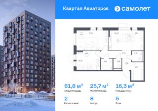 Предлагается 2-комнатная квартира комфорт-класса 61,7 кв.м в корпусе 8 на 14 этаже, в ЖК ''Квартал Авиаторов''Квартира с чистовой отделкой. Доступность дополнительных опций уточняйте у застройщика.Приобрести квартиру возможно по специальным акциям от застройщика, с текущими условиями акций можно ознакомиться в блоке ''Акций''.Цена динамическая и может отличаться, уточняйте актуальность у застройщика.''Квартал Авиаторов'' — жилой комплекс комфорт-класса, расположенный в 2 км от железнодорожной станции Балашиха (5 минут на автомобиле, 30 минут пешком). Поблизости — Горенский лесопарк и заповедник ''Лосиный остров''. В проекте предусмотрены закрытые дворы с детскими и спортивными площадками, безбарьерная среда.