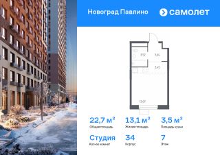 Строим кварталы для жизни с заботой о будущем. Предлагается квартира студия комфорт-класса 22,7 кв.м в корпусе 34 на 7 этаже, в ЖК ''Новоград Павлино''Квартира с чистовой отделкой. Доступность дополнительных опций уточняйте у застройщика.Приобрести квартиру возможно по специальным акциям от застройщика, с текущими условиями акций можно ознакомиться в блоке ''Акций''.Цена динамическая и может отличаться, уточняйте актуальность у застройщика.''Новоград Павлино'' находится в 13 км от МКАД рядом с рекой Пехорка и в окружении трех лесопарков - Павлинского, Салтыковского и Ольгинского. Современные монолитно-кирпичные дома с широким выбором квартир. В жилом комплексе представлены разные планировки европейского формата с высотой потолков 2,8 м.