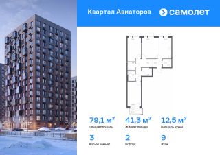Строим кварталы для жизни с заботой о будущем. Предлагается 3-комнатная квартира комфорт-класса 79,11 кв.м в корпусе 2 на 9 этаже, в ЖК ''Квартал Авиаторов''Квартира с предчистовой отделкой. Доступность дополнительных опций уточняйте у застройщика.Приобрести квартиру возможно по специальным акциям от застройщика, с текущими условиями акций можно ознакомиться в блоке ''Акций''.Цена динамическая и может отличаться, уточняйте актуальность у застройщика.''Квартал Авиаторов'' — жилой комплекс комфорт-класса, расположенный в 2 км от железнодорожной станции Балашиха (5 минут на автомобиле, 30 минут пешком). Поблизости — Горенский лесопарк и заповедник ''Лосиный остров''. В проекте предусмотрены закрытые дворы с детскими и спортивными площадками, безбарьерная среда.