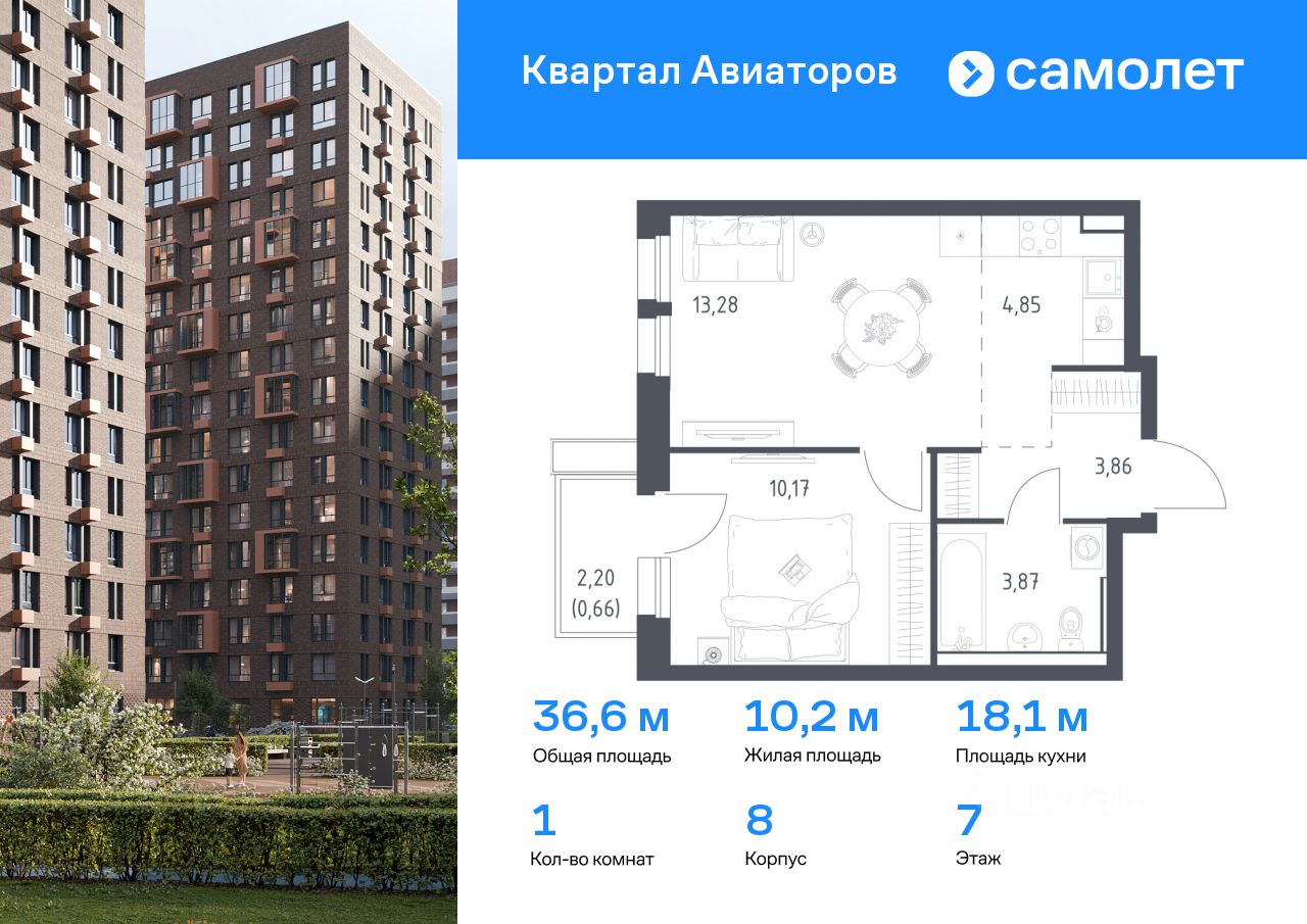 Строим кварталы для жизни с заботой о будущем. Предлагается 1-комнатная квартира комфорт-класса 36,6 кв.м в корпусе 8 на 7 этаже, в ЖК ''Квартал Авиаторов'' Квартира с чистовой отделкой. Доступность дополнительных опций уточняйте у застройщика. Приобрести квартиру возможно по специальным акциям от застройщика, с текущими условиями акций можно ознакомиться в блоке ''Акций''. Цена динамическая и может отличаться, уточняйте актуальность у застройщика. ''Квартал Авиаторов'' — жилой комплекс комфорт-класса, расположенный в 2 км от железнодорожной станции Балашиха (5 минут на автомобиле, 30 минут пешком). Поблизости — Горенский лесопарк и заповедник ''Лосиный остров''. В проекте предусмотрены закрытые дворы с детскими и спортивными площадками, безбарьерная среда.
