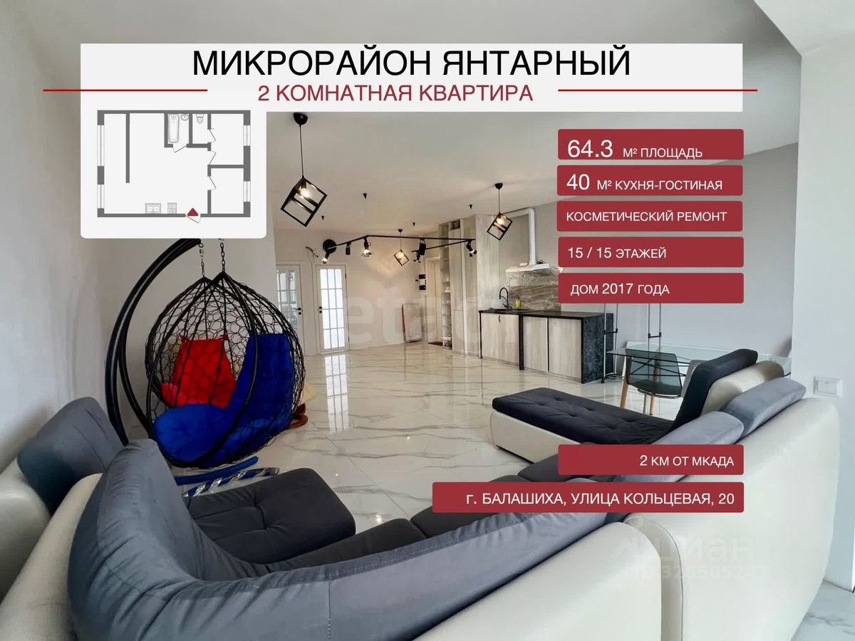 Номер в базе: 9147606.Двухкомнатная квартира площадью 64,3 м² в микрорайоне ''Янтарный'' (Щитниково, Балашиха) с большой гостиной и диванной группой. Сдается стильная квартира с минимальным набором — твой идеальный старт! О КВАРТИРЕ: • Общая площадь 64,3 м² с просторной кухней-гостиной 40 м². • 2 светлые комнаты ( 9 м² каждая) - одна из них мастер-спальня (окнами во двор). Панорамные окна . • Ремонт, просторная планировка, без лишнего . • Мебель: трансформер-диван, мини-кухонный гарнитур, кровать, из техники — минихолодильник, стиральная машина. • Теплые полы и два санузла (раздельный и совмещенный). • На этаже всего 2 квартиры — максимум уюта и приватности. Коммунальные платежи включены в стоимость аренды. О ДОМЕ: Есть пассажирский и грузовой лифты. Территория ЖК охраняется, оборудована системой видеонаблюдения и формат закрытого двора. Район отличается развитой инфраструктурой: в шаговой доступности магазины, аптеки, кафе и поликлиника. О ЛОКАЦИИ: Локация сочетает близость к Москве. До МКАД — 2 км по Щелковскому шоссе, дорога до метро ''Щёлковская'' занимает 10 - 15 минут на автомобиле или общественном транспорте. ВАЖНО: Коммунальные услуги оплачиваются отдельно до 15 тыс.рублей. Рассмотрим семью или семейную пару без животных. Предложение для тех, кто ценит свободу. Быстрый въезд! Код пользователя: 178452