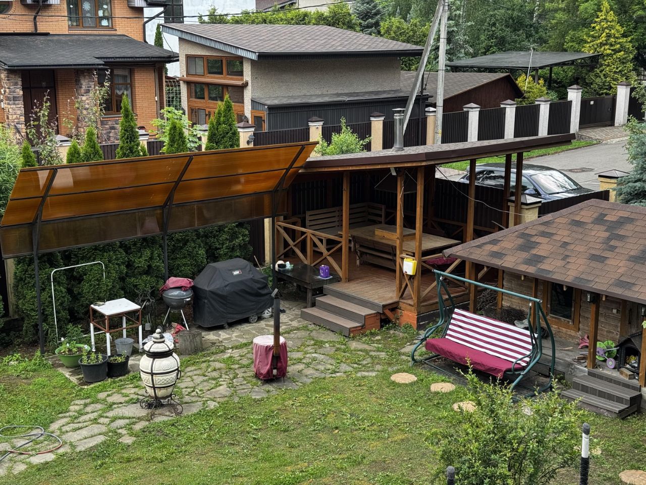 Отдельно стоящий гараж на 3 машины с гостевым этажом. Ландшафтный дизайн, зона барбекю, беседка с мангалом, дровница, детская зона, будка с подогревом для собаки, место для бассейна.