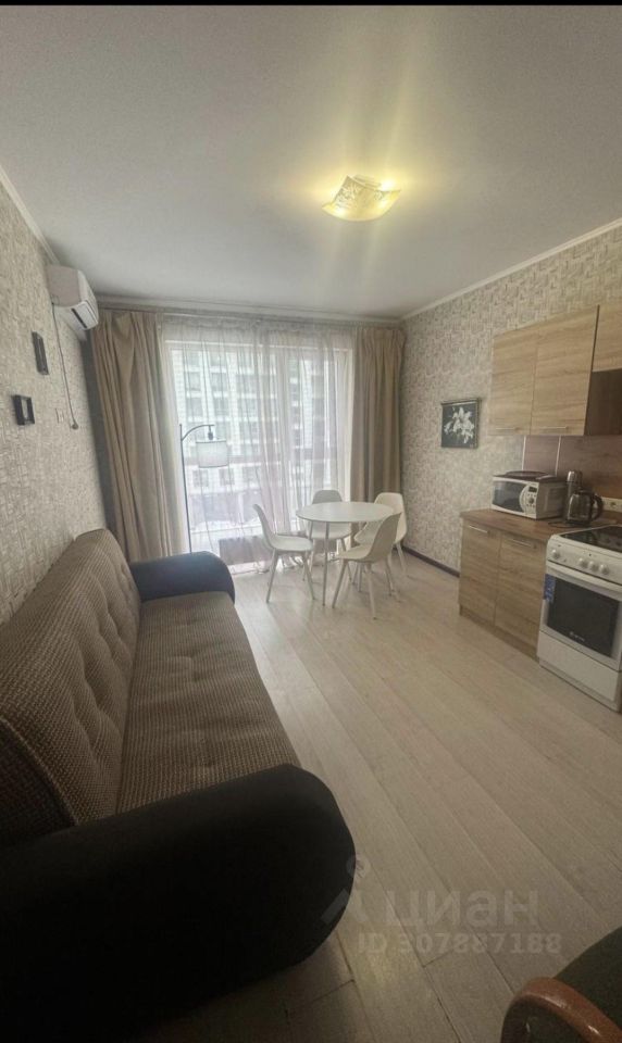 Ремонт косметический , кухня и комната изолированы , большая гардеробная комната , просторный санузел . В комнате: 2-х сп. диван , горка , комод. кондиционер . На кухне: встроенная кухня , обеденный стол со стульями , холодильник , плита , микроволновка , диван . С ребенком можно , строго без животных . Депозит 50%
