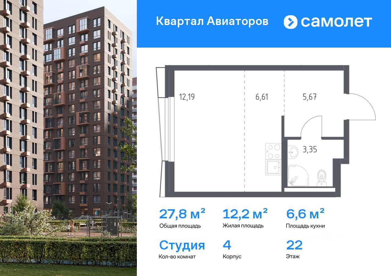 Строим кварталы для жизни с заботой о будущем. Предлагается квартира студия комфорт-класса 27,82 кв.м в корпусе 4 на 22 этаже, в ЖК ''Квартал Авиаторов'' Квартира без отделки. Доступность опции ''отделка'' и возможность комплектации мебелью и декором уточняйте у застройщика.