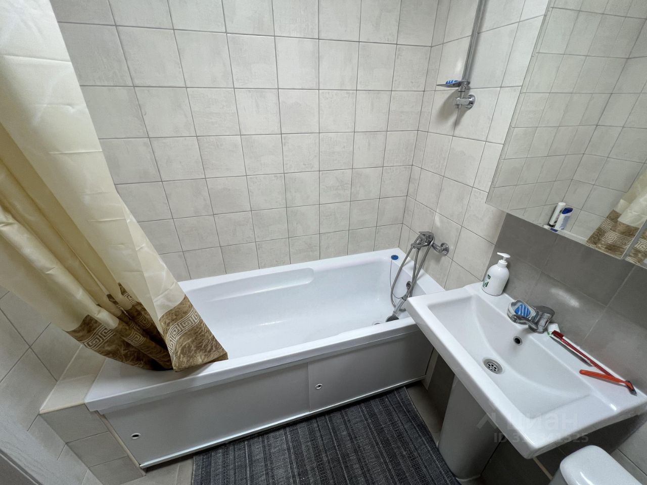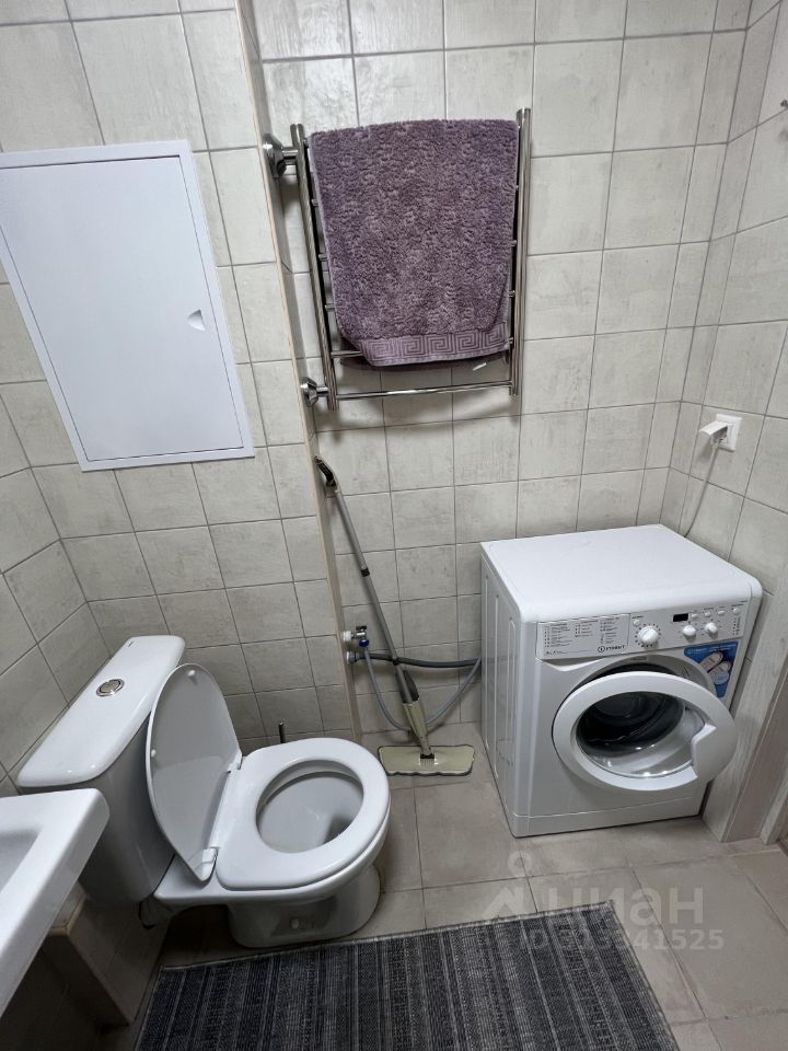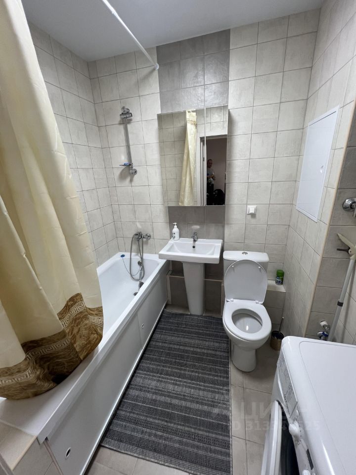 Санузел совмещенный отделанный плиткой. Имеется стиральная машина.