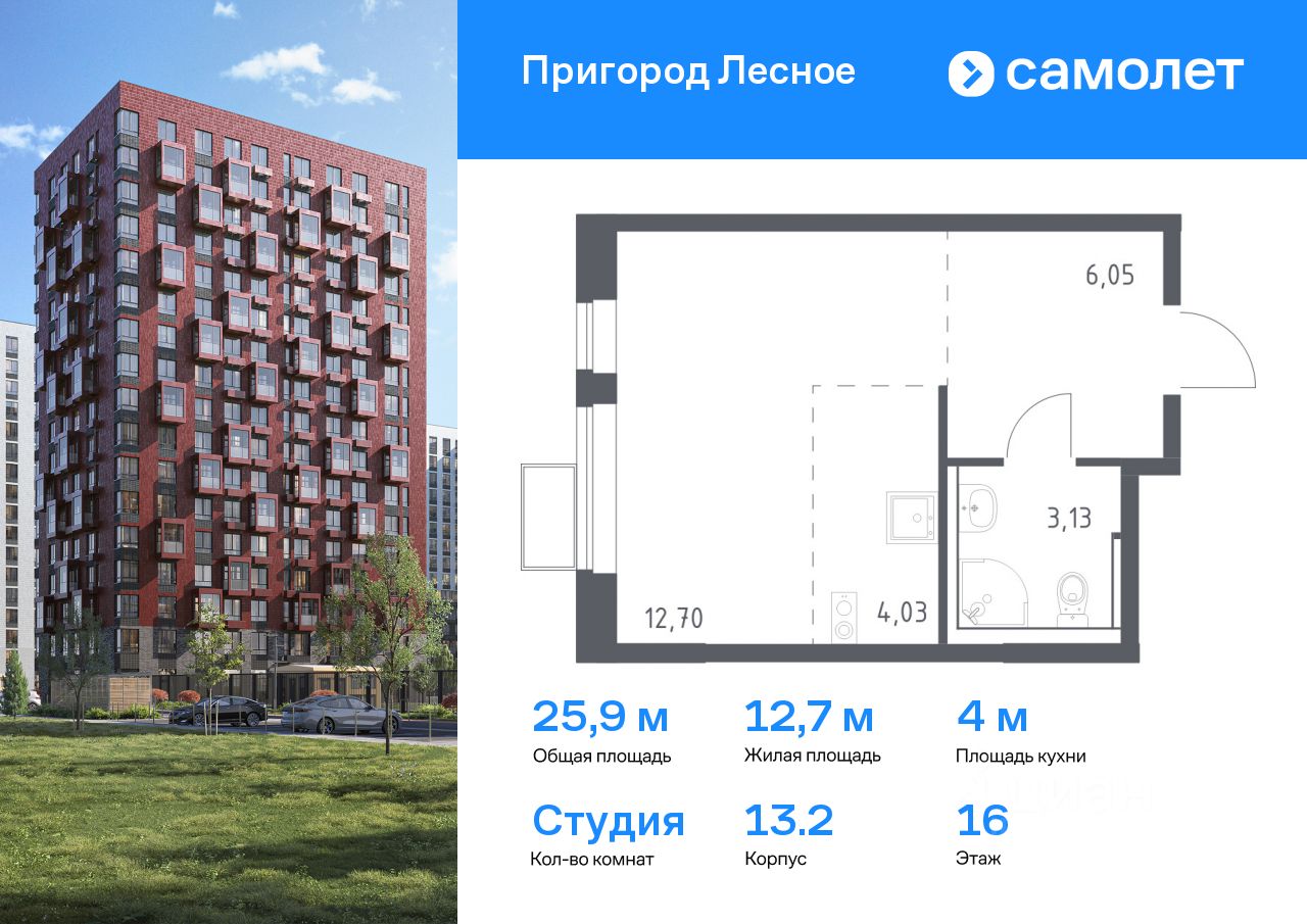 Предлагается квартира студия комфорт-класса 25,91 кв.м в корпусе 13.2 на 16 этаже, в ЖК ''Пригород Лесное'' Квартира с чистовой отделкой. Доступность дополнительных опций уточняйте у застройщика.