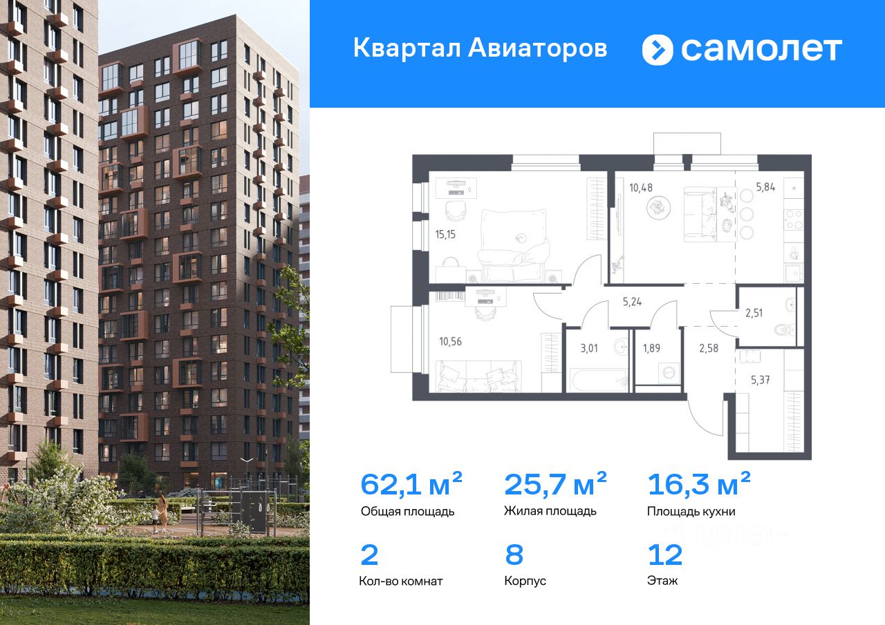 Предлагается 2-комнатная квартира комфорт-класса 62,1 кв.м в корпусе 8 на 12 этаже, в ЖК ''Квартал Авиаторов''