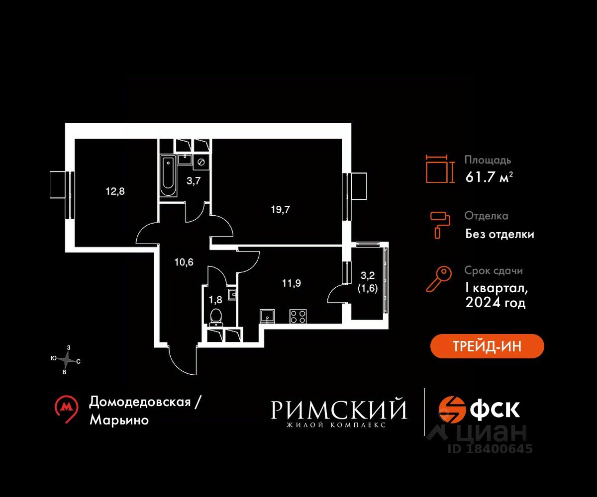 Транспортная доступность: Всего 2 км от МКАД, 15 минут на транспорте до метро ''Домодедовская'' и ''Марьино''