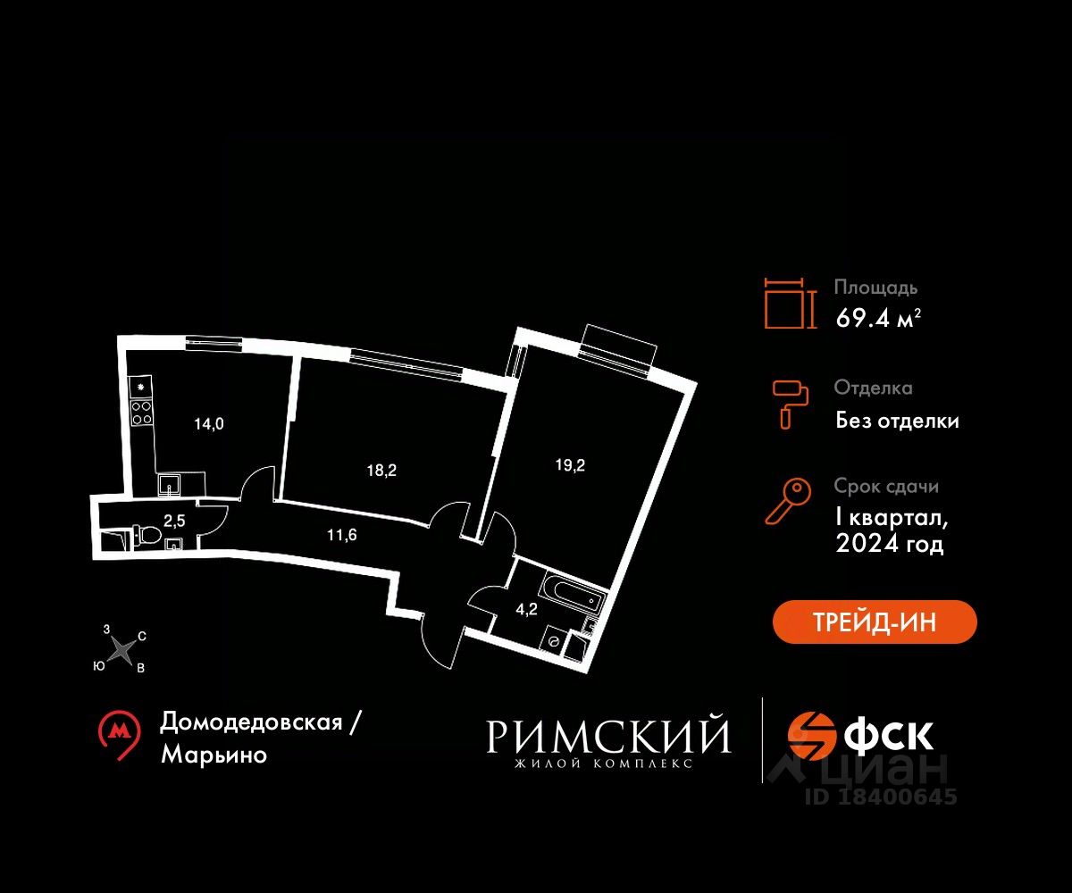 Максимальные скидки при 100% оплате. Готовый дом! Прямая продажа от застройщика! Жилой Комплекс класса Комфорт. Продаётся 2-к квартира номер 1215 в сданном корпусе общей площадью 69.4 кв.м на 2-м этаже 12 этажного дома.