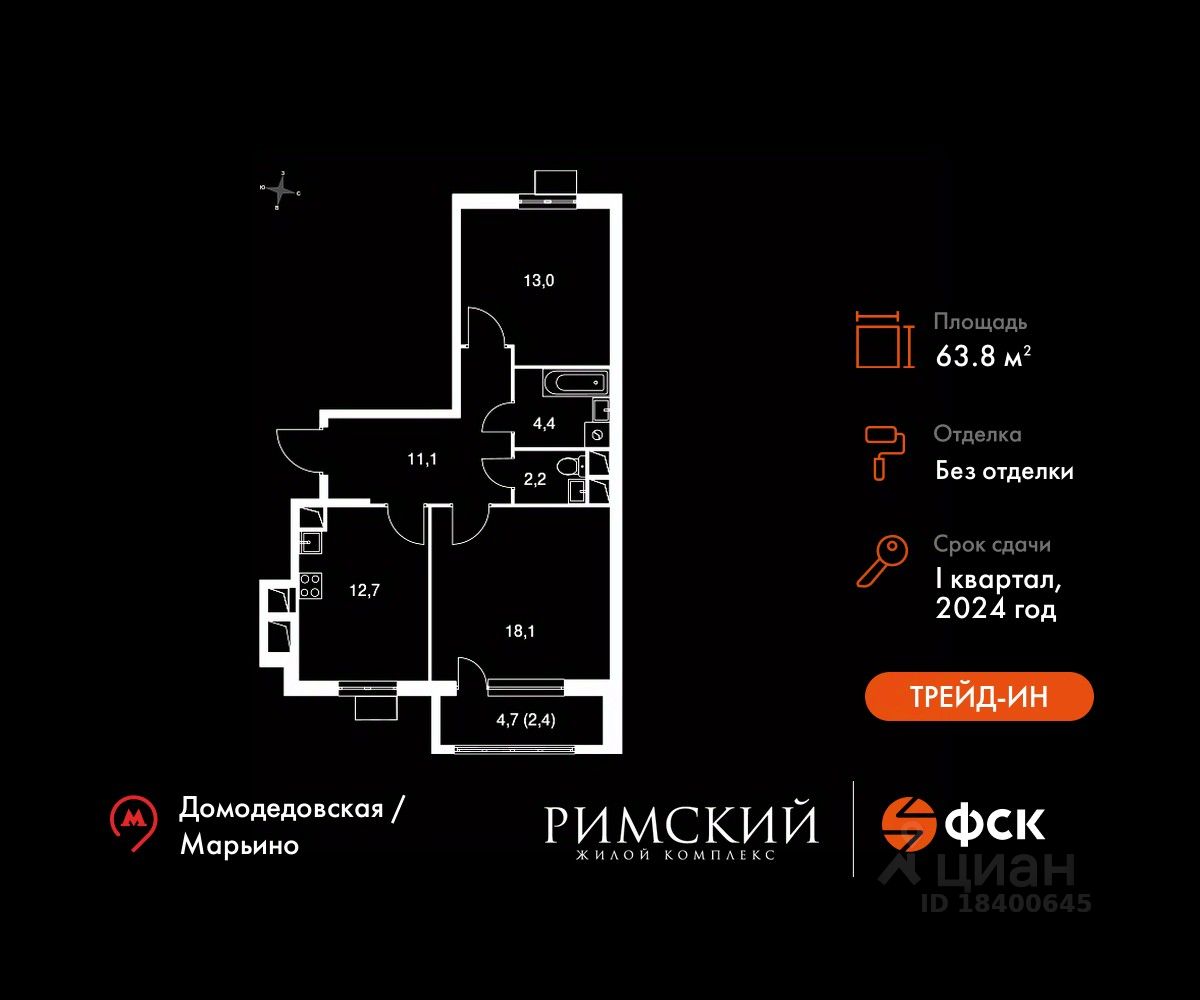 Максимальные скидки при 100% оплате. Готовый дом! Прямая продажа от застройщика! Жилой Комплекс класса Комфорт. Продаётся 2-к квартира номер 402 в сданном корпусе общей площадью 63.8 кв.м на 3-м этаже 15 этажного дома.