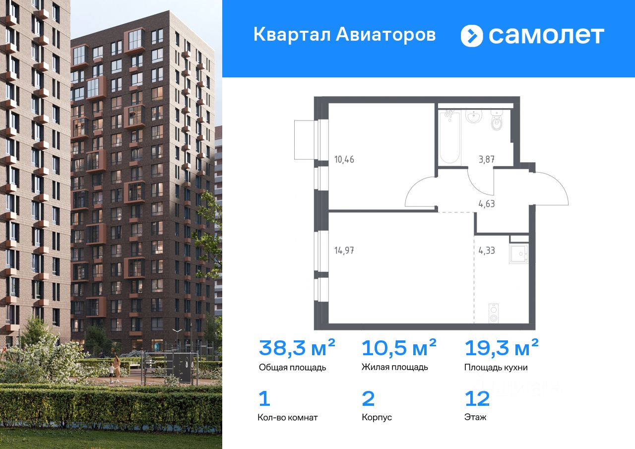 Предлагается 1-комнатная квартира комфорт-класса 38,26 кв.м в корпусе 2 на 12 этаже, в ЖК ''Квартал Авиаторов''