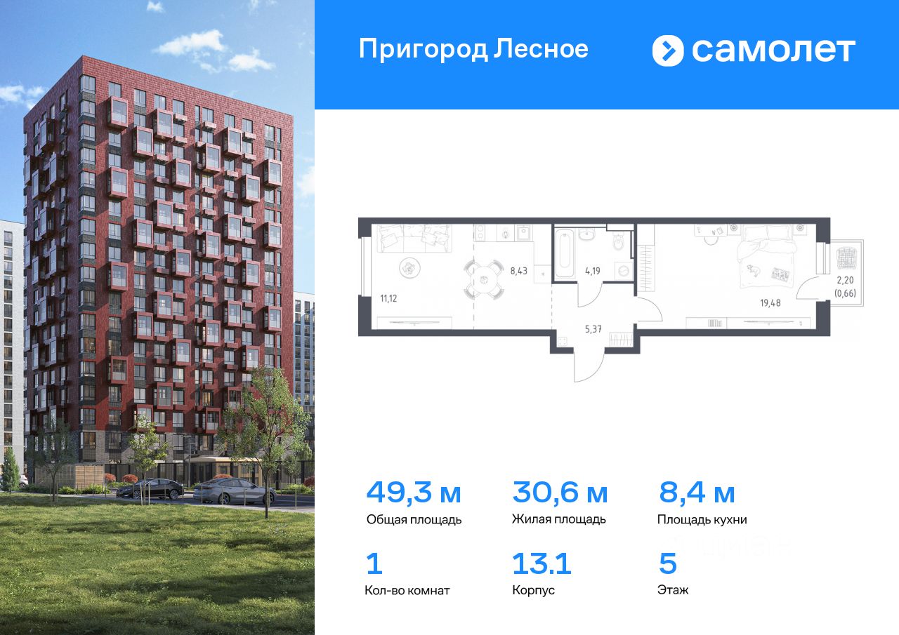 Предлагается 1-комнатная квартира комфорт-класса 49,25 кв.м в корпусе 13.1 на 5 этаже, в ЖК ''Пригород Лесное'' Квартира с чистовой отделкой. Доступность дополнительных опций уточняйте у застройщика.