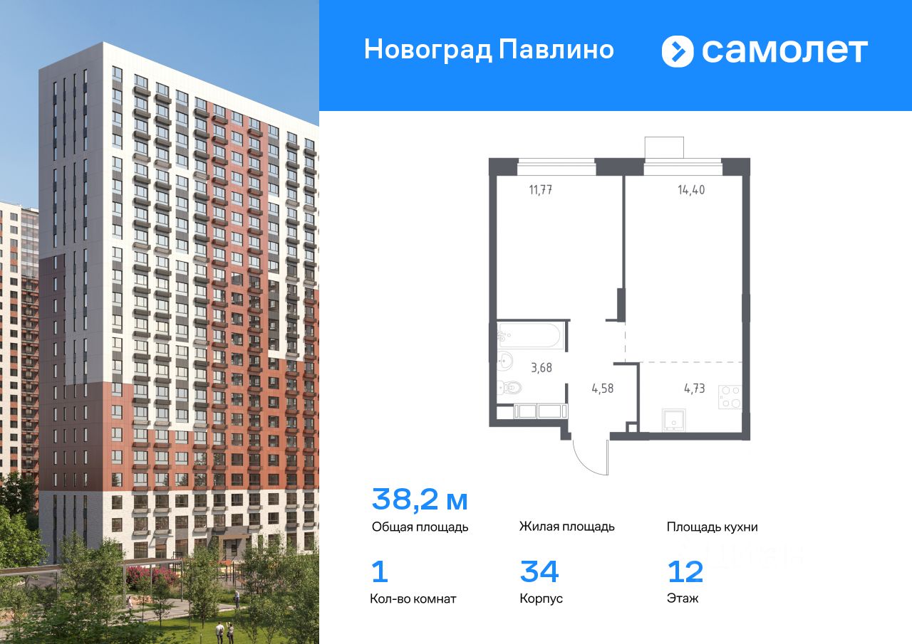 Предлагается 1-комнатная квартира комфорт-класса 38,2 кв.м в корпусе 34 на 12 этаже, в ЖК ''Новоград Павлино''