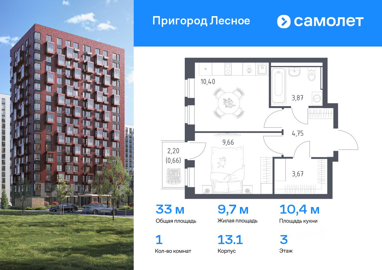 Предлагается 1-комнатная квартира комфорт-класса 33,01 кв.м в корпусе 13.1 на 3 этаже, в ЖК ''Пригород Лесное'' Квартира с чистовой отделкой. Доступность дополнительных опций уточняйте у застройщика.