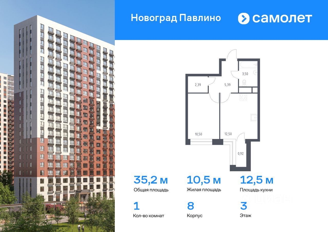 Предлагается 1-комнатная квартира комфорт-класса 35,2 кв.м в корпусе 8 на 3 этаже, в ЖК ''Новоград Павлино''
