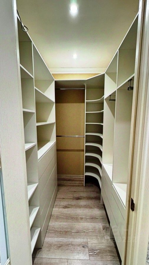 Отдельная гардеробная с большим количеством ящиков и полок.