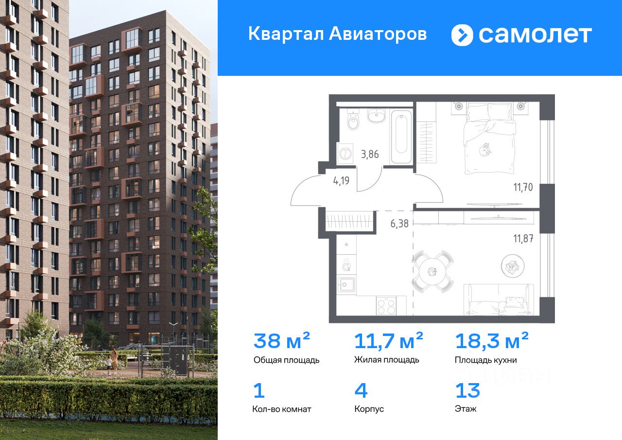 Предлагается 1-комнатная квартира комфорт-класса 38 кв.м в корпусе 4 на 13 этаже, в ЖК ''Квартал Авиаторов''