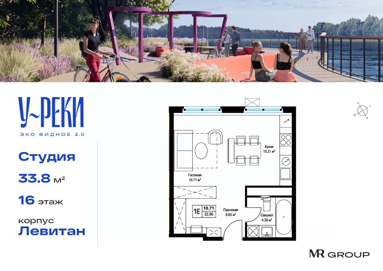 Прямая продажа от застройщика. Продаётся студия общей площадью 33.80 кв. м с чистовой отделкой в ЖК ''У реки. Эко Видное 2.0'' на 16-м этаже 17 этажного корпуса Левитан. Все корпуса введены в эксплуатацию. Выдача ключей - II кв. 2025г. Семнадцатиэтажный корпус ''Левитан'' состоит из 13 секций, образующих в плане закрытый периметр двора. Эко-повестка и комфорт — это формат осознанной жизни, разработанный ''Бюро А4'' для благоустройства корпуса ''Левитан''. В проекте развиваются две темы: образ реки и настроения пейзажей Левитана которые раскрываются через четыре функциональные зоны.