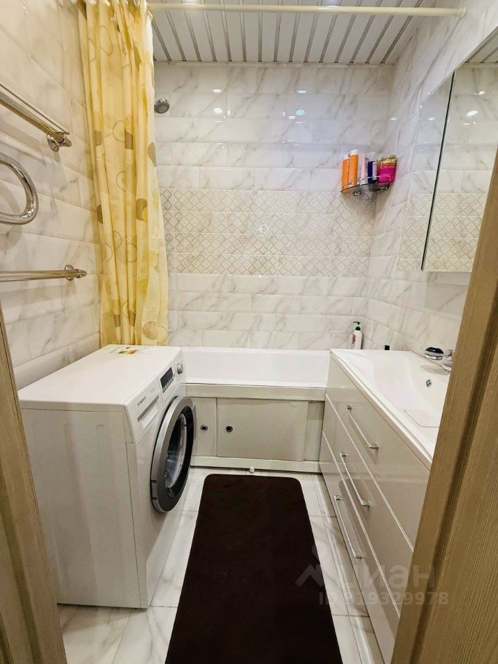 Санузел раздельный: в ванной помещается полноразмерная ванна, стиральная машинка и широкая тумба с раковиной и зеркалом, на стенах и полу ванной комнаты светлая керамическая плитка.