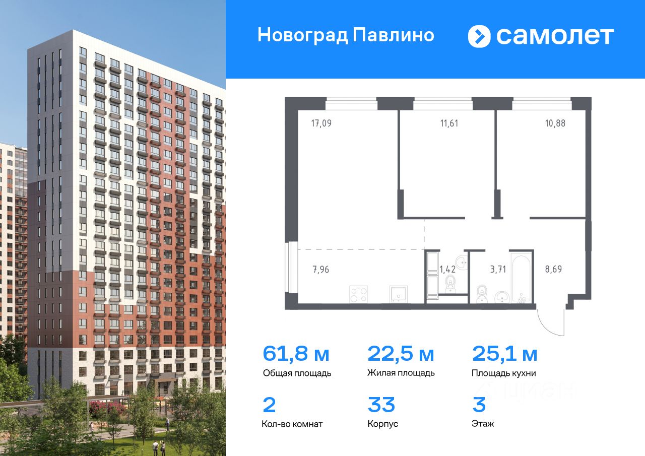 Предлагается 2-комнатная квартира комфорт-класса 61,8 кв.м в корпусе 33 на 3 этаже, в ЖК ''Новоград Павлино''
