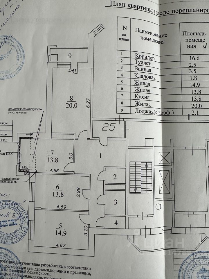 Квартира расположена на 9 этаже. Общая площадь 86,9 кв.м., (Кухня 13,8 кв.м., жилые комнаты 14,9/13,8/20,0 кв.м., раздельный сан.узел, кладовая, лоджия). Общий закрытый тамбур на две квартиры.