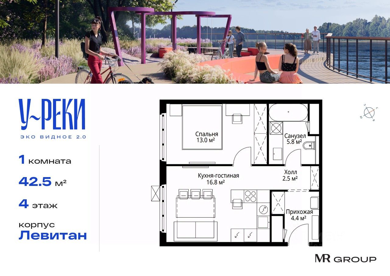 Прямая продажа от застройщика. Продаётся 1-к квартира общей площадью 42.50 кв. м с чистовой отделкой в ЖК ''У реки. Эко Видное 2.0'' на 4-м этаже 17 этажного корпуса Левитан. Все корпуса введены в эксплуатацию. Выдача ключей - II кв. 2025г. Семнадцатиэтажный корпус ''Левитан'' состоит из 13 секций, образующих в плане закрытый периметр двора. Эко-повестка и комфорт — это формат осознанной жизни, разработанный ''Бюро А4'' для благоустройства корпуса ''Левитан''. В проекте развиваются две темы: образ реки и настроения пейзажей Левитана которые раскрываются через четыре функциональные зоны.