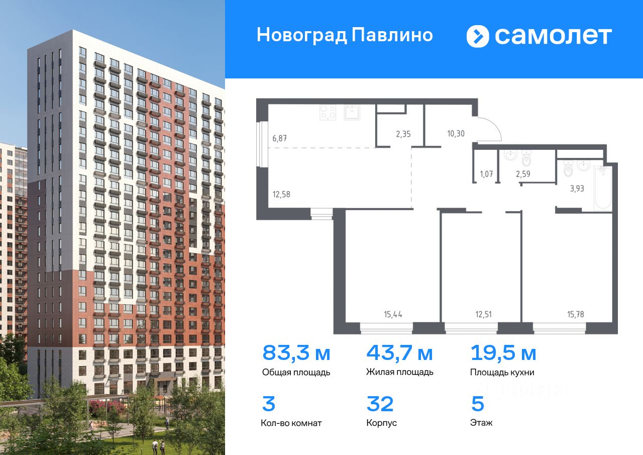 Предлагается 3-комнатная квартира комфорт-класса 83,3 кв.м в корпусе 32 на 5 этаже, в ЖК ''Новоград Павлино''