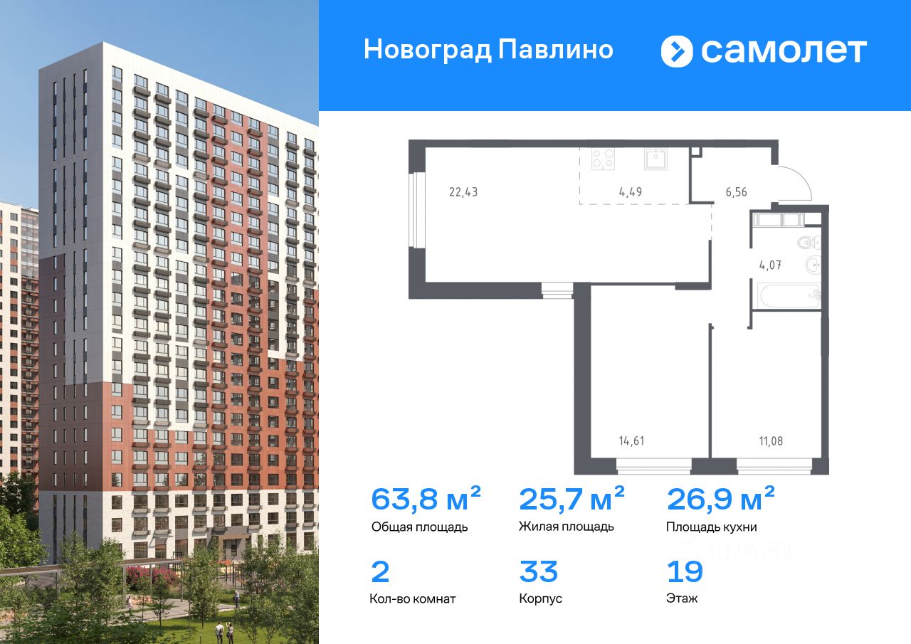 Предлагается 2-комнатная квартира комфорт-класса 63,8 кв.м в корпусе 33 на 19 этаже, в ЖК ''Новоград Павлино''