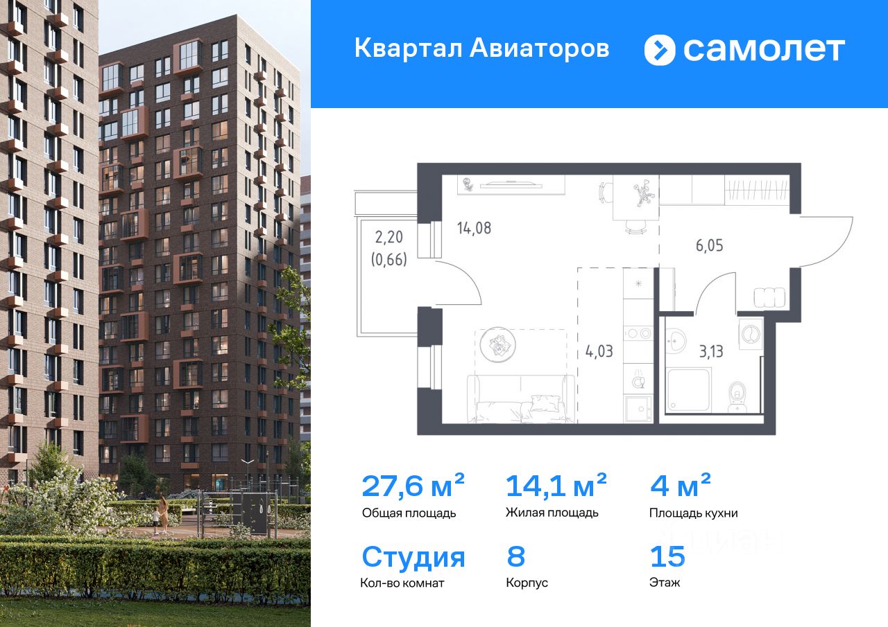 Предлагается квартира студия комфорт-класса 27,6 кв.м в корпусе 8 на 15 этаже, в ЖК ''Квартал Авиаторов''