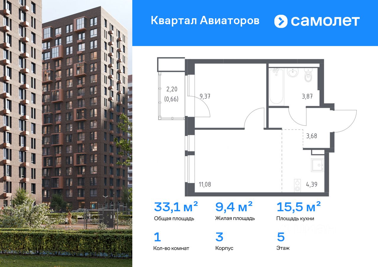 Предлагается 1-комнатная квартира комфорт-класса 33,05 кв.м в корпусе 3 на 5 этаже, в ЖК ''Квартал Авиаторов''