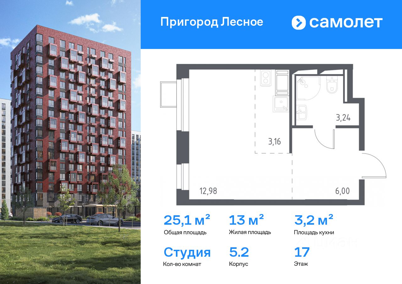 Строим кварталы для жизни с заботой о будущем. Предлагается квартира студия комфорт-класса 25,1 кв.м в корпусе 5.2 на 17 этаже, в ЖК ''Пригород Лесное'' Квартира с чистовой отделкой. Доступность дополнительных опций уточняйте у застройщика.