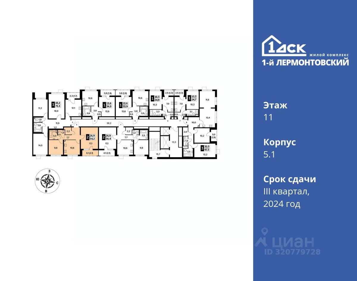 Максимальные скидки при 100% оплате. Корпус сдан! Прямая продажа от застройщика! Жилой Комплекс класса Комфорт плюс. Продаётся 2-к квартира номер 235 в сданном корпусе общей площадью 54.2 кв.м на 11-м этаже 24 этажного дома.
