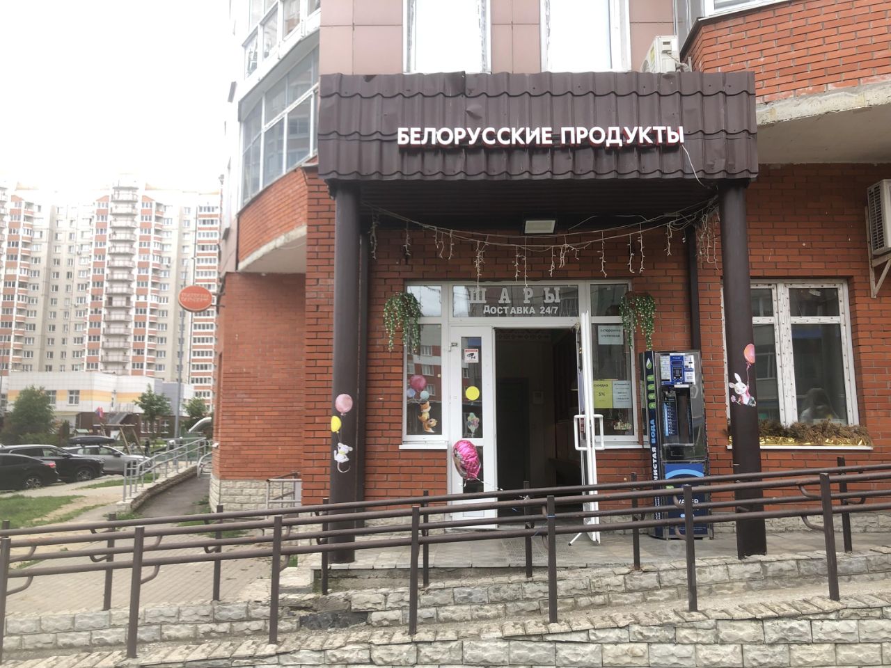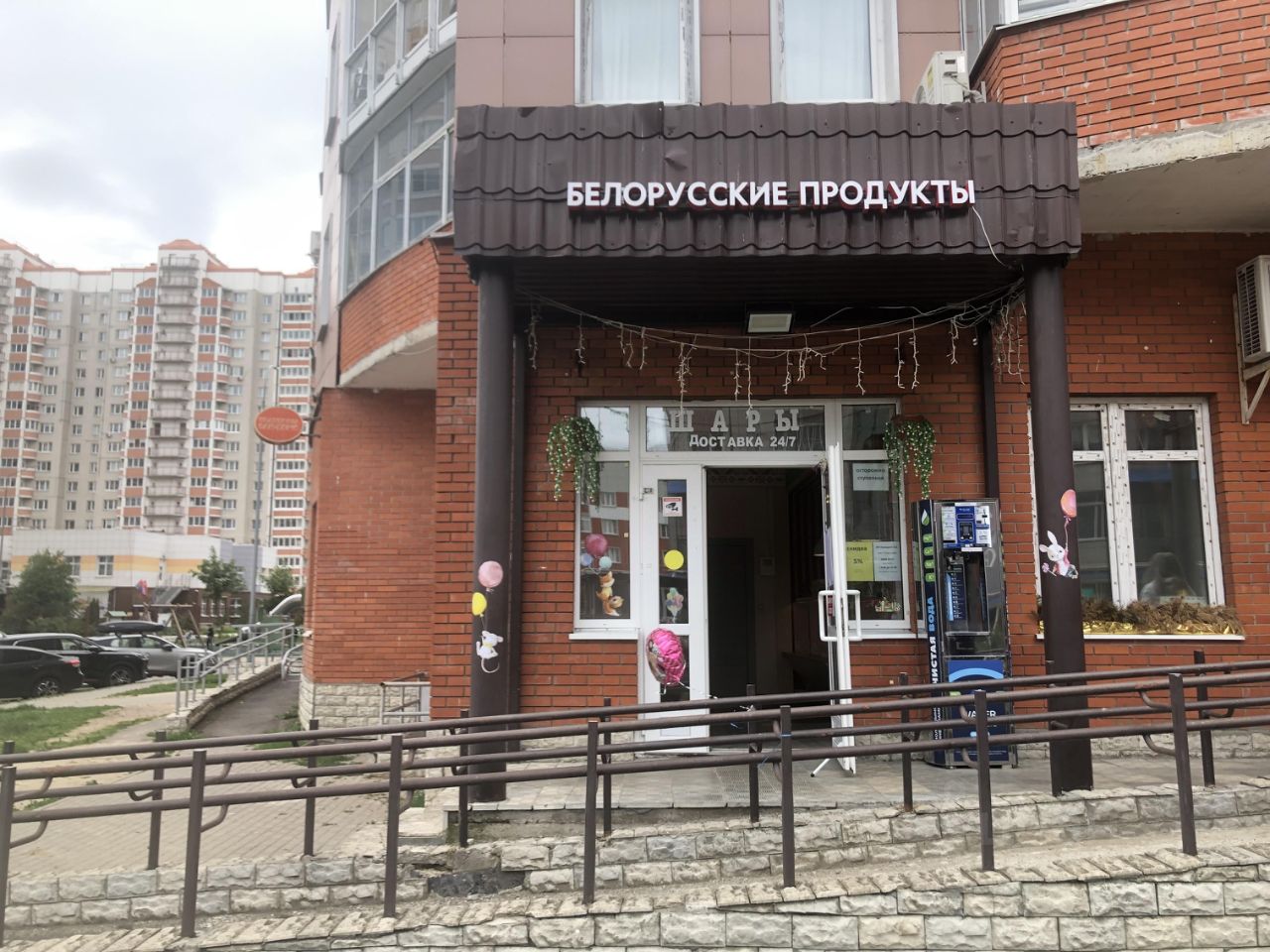 Рядом Белорусские продукты, Ателье, товары для праздников и игрушки, Аптека, Винлаб, кофейня, вендинговый аппарат чистой воды.