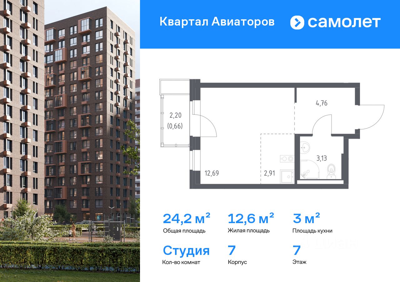 Предлагается квартира студия комфорт-класса 24,15 кв.м в корпусе 7 на 7 этаже, в ЖК ''Квартал Авиаторов''