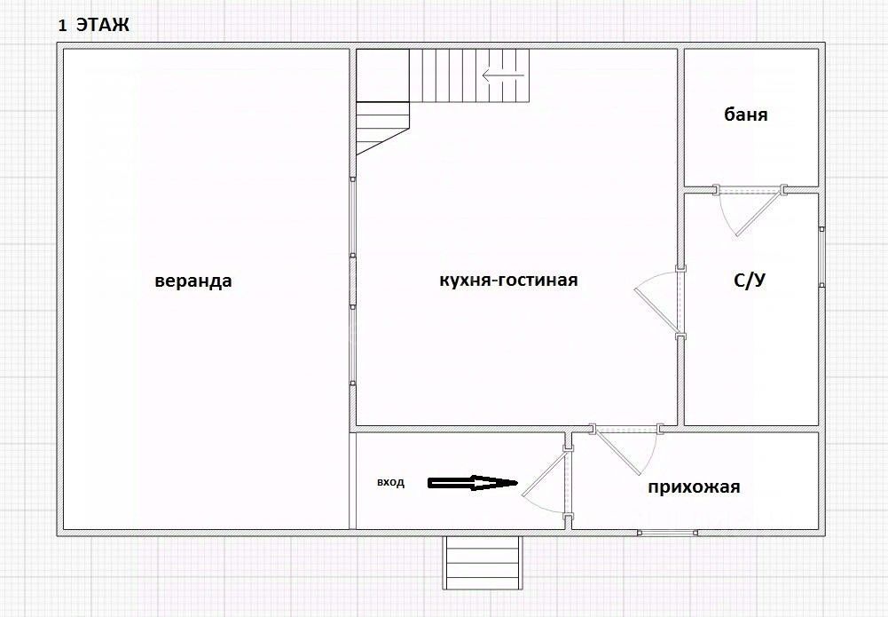 На первом этаже: кухня-гостиная с мебелью, просторный С/У и баня. На втором этаже: просторная комната.