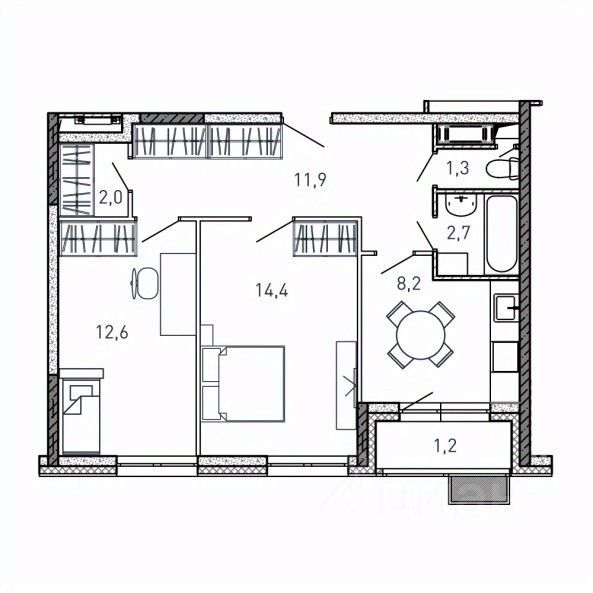 Общая площадь54,3 м2