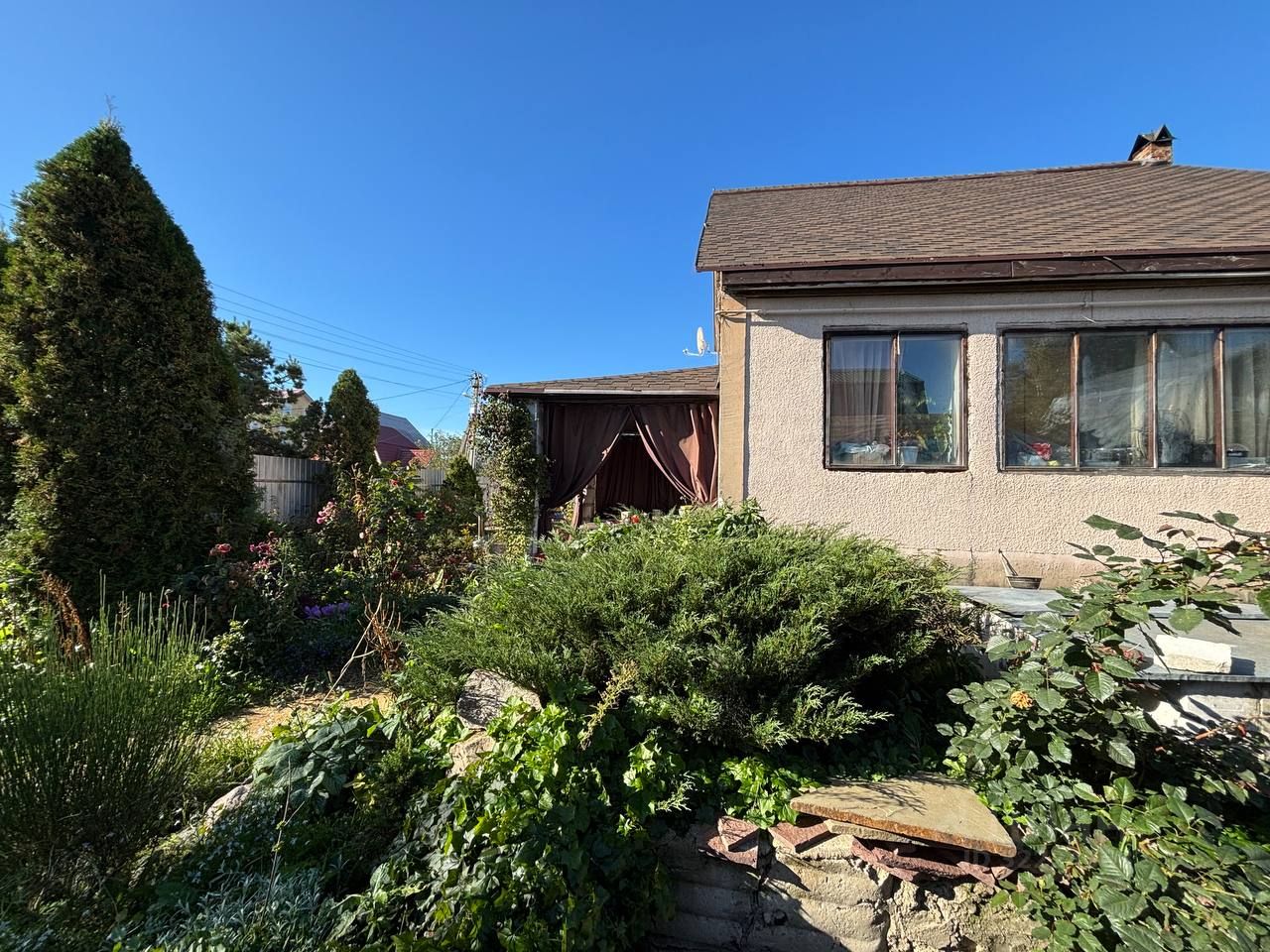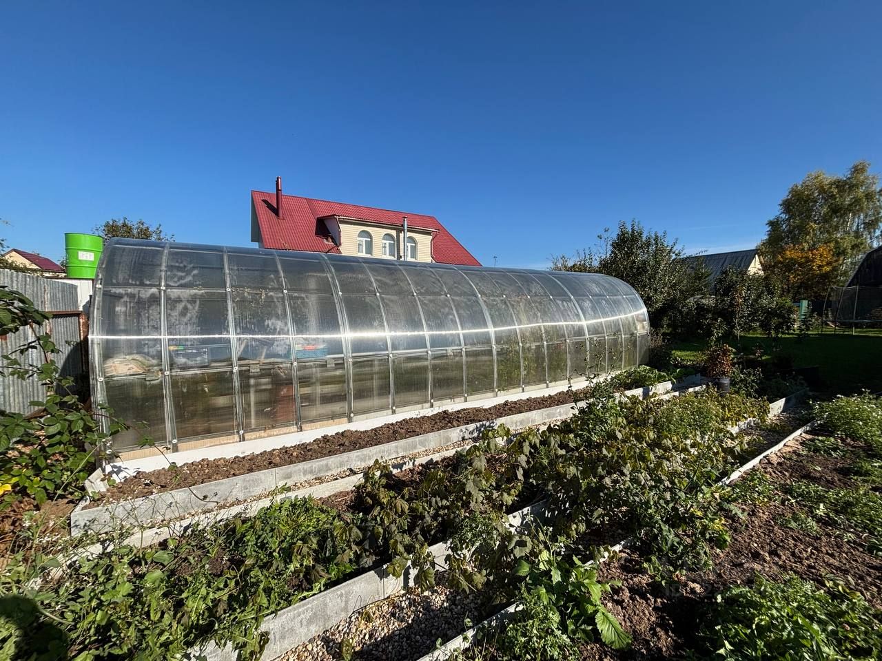 Площадь 12 соток, со всех сторон окружен забором, ухоженный: плодовые и декоративные кустарники и деревья, клубника, малина, шикарные розы, цветники и миксбордеры.