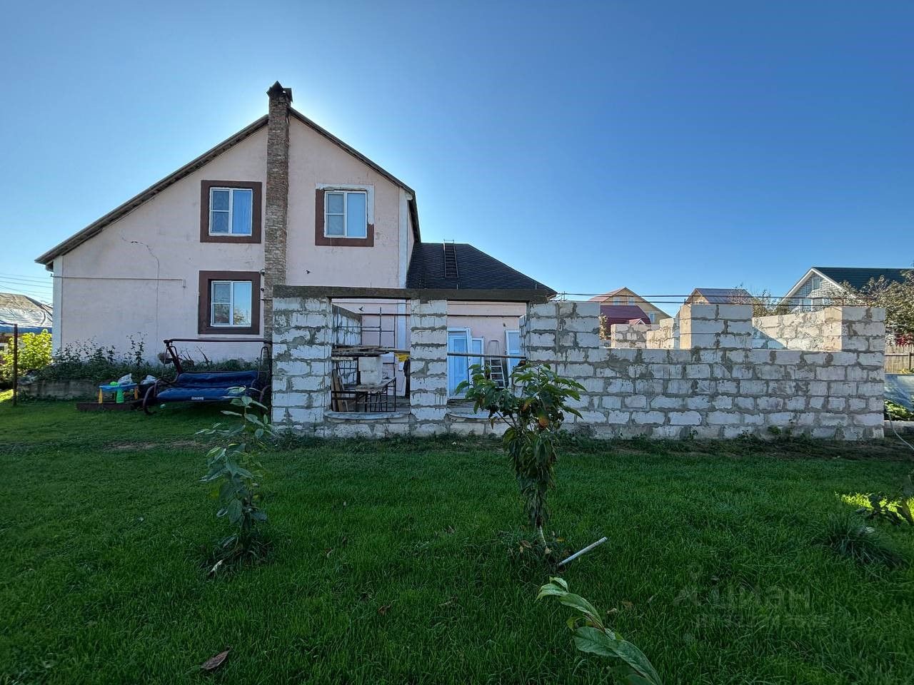 На участке имеется подогреваемый бассейн с системой фильтрации воды. Залит основательный фундамент, на котором можно построить гостевой дом, беседку с зоной барбекю или использовать по вашему усмотрению.