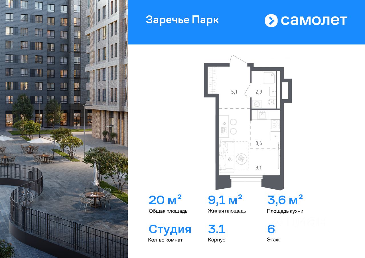 Строим кварталы для жизни с заботой о будущем. Предлагается квартира студия бизнес-класса 20 кв.м в корпусе 3.1 на 6 этаже, в ЖК ''Заречье Парк'' Квартира с чистовой отделкой. Доступность дополнительных опций уточняйте у застройщика.