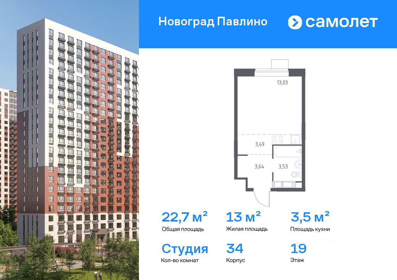 Строим кварталы для жизни с заботой о будущем. Предлагается квартира студия комфорт-класса 22,7 кв.м в корпусе 34 на 19 этаже, в ЖК ''Новоград Павлино''