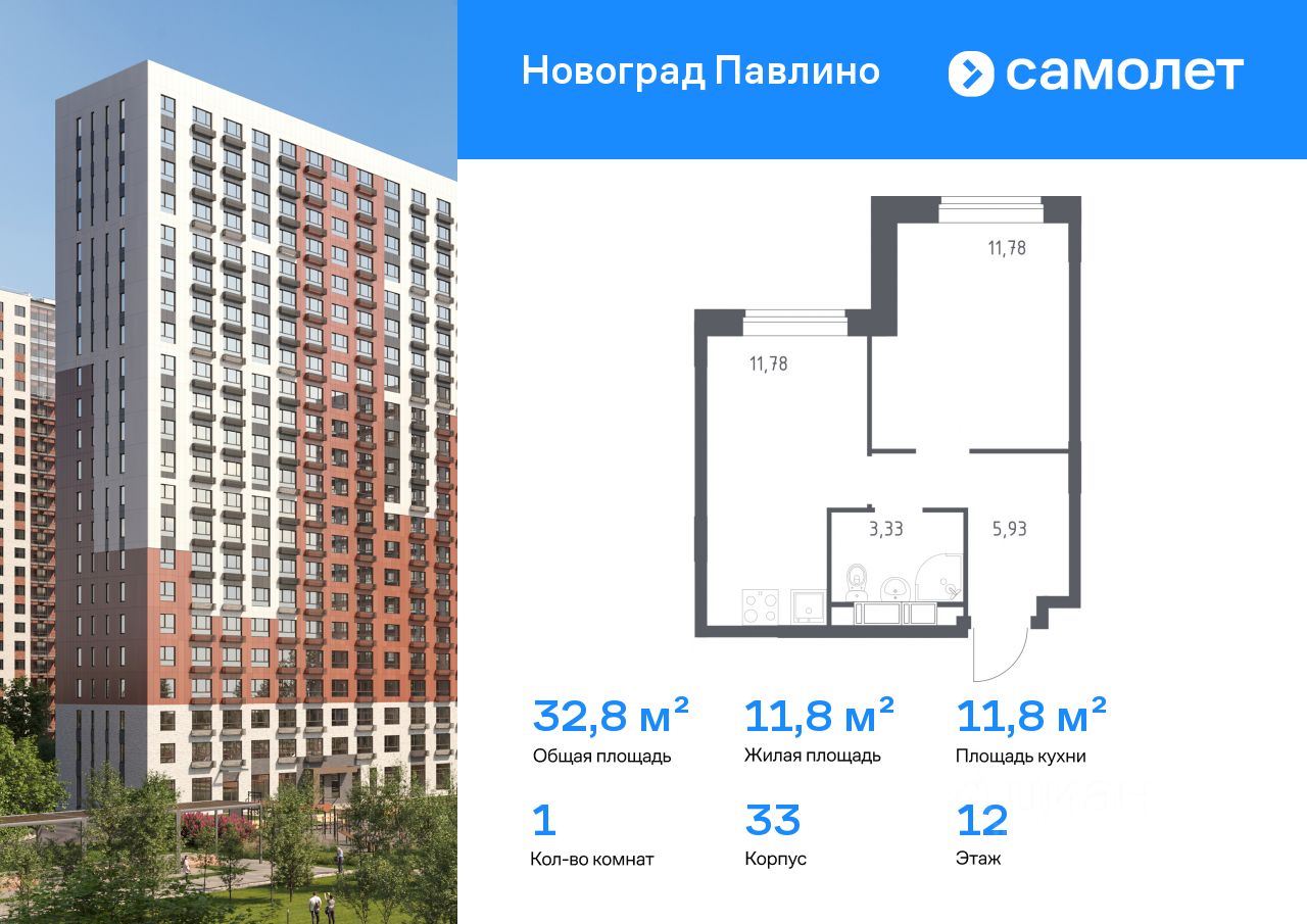 Строим кварталы для жизни с заботой о будущем. Предлагается 1-комнатная квартира комфорт-класса 32,8 кв.м в корпусе 33 на 12 этаже, в ЖК ''Новоград Павлино''