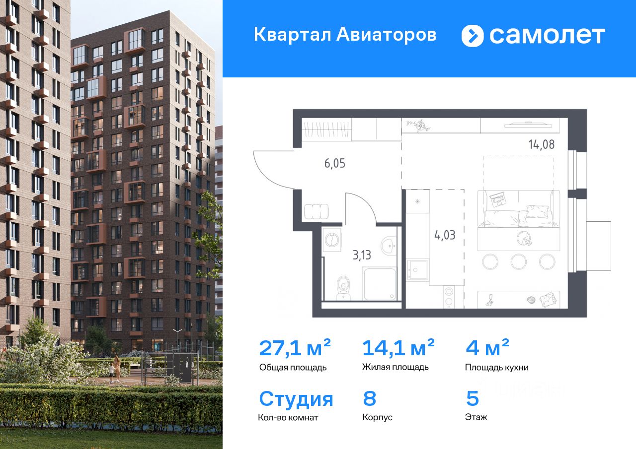 Строим кварталы для жизни с заботой о будущем. Предлагается квартира студия комфорт-класса 27,1 кв.м в корпусе 8 на 5 этаже, в ЖК ''Квартал Авиаторов''