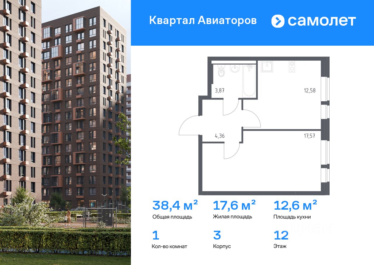 Строим кварталы для жизни с заботой о будущем. Предлагается 1-комнатная квартира комфорт-класса 38,38 кв.м в корпусе 3 на 12 этаже, в ЖК ''Квартал Авиаторов'' Квартира с чистовой отделкой. Доступность дополнительных опций уточняйте у застройщика.