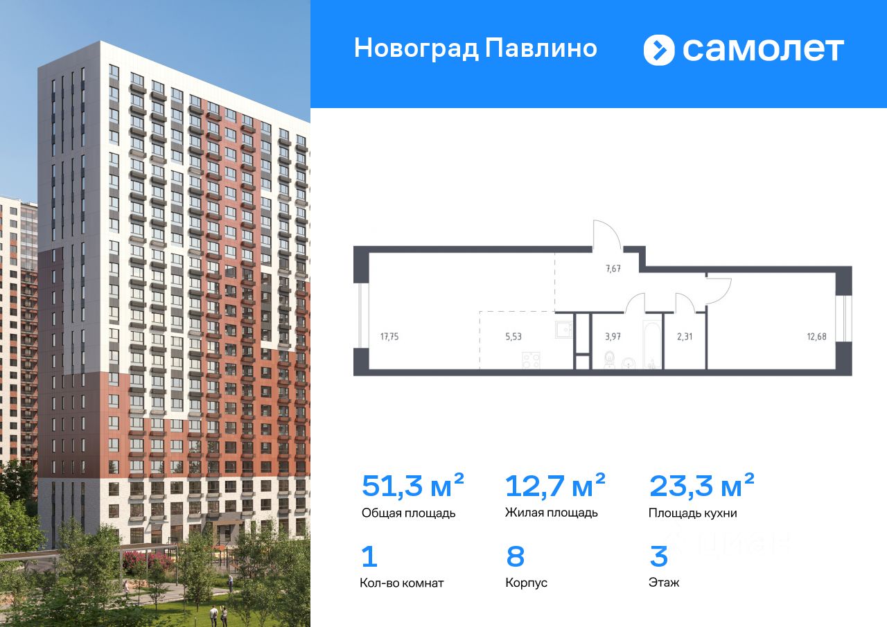 Строим кварталы для жизни с заботой о будущем. Предлагается 1-комнатная квартира комфорт-класса 51,3 кв.м в корпусе 8 на 3 этаже, в ЖК ''Новоград Павлино''