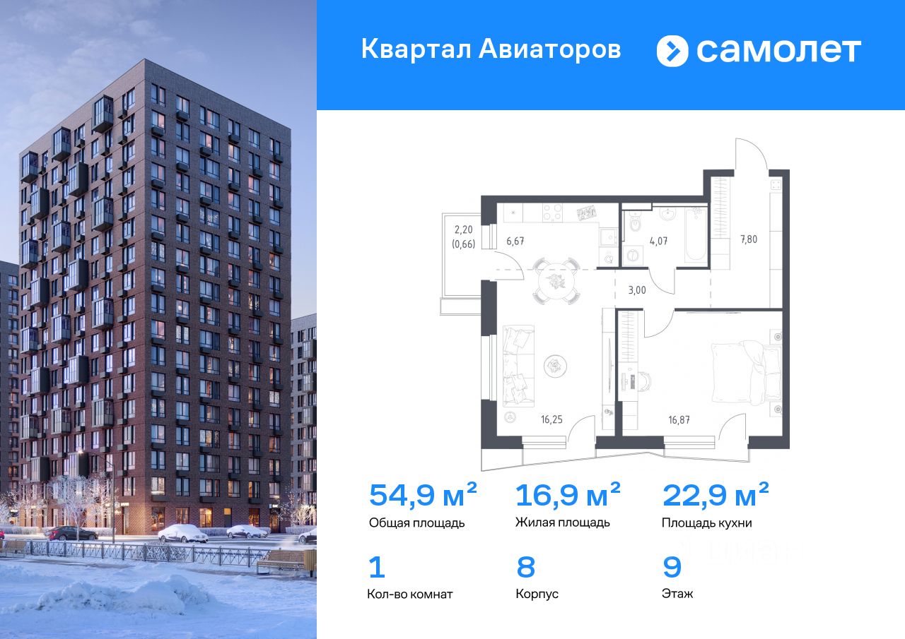 Строим кварталы для жизни с заботой о будущем. Предлагается 1-комнатная квартира комфорт-класса 54,9 кв.м в корпусе 8 на 9 этаже, в ЖК ''Квартал Авиаторов'' Квартира с чистовой отделкой. Доступность дополнительных опций уточняйте у застройщика.