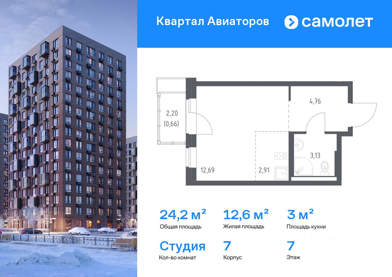 Строим кварталы для жизни с заботой о будущем. Предлагается квартира студия комфорт-класса 24,15 кв.м в корпусе 7 на 7 этаже, в ЖК ''Квартал Авиаторов'' Квартира с чистовой отделкой. Доступность дополнительных опций уточняйте у застройщика.