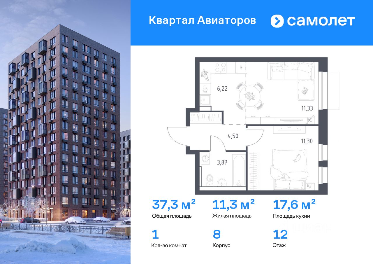 Строим кварталы для жизни с заботой о будущем. Предлагается 1-комнатная квартира комфорт-класса 37,3 кв.м в корпусе 8 на 12 этаже, в ЖК ''Квартал Авиаторов'' Квартира с чистовой отделкой. Доступность дополнительных опций уточняйте у застройщика.