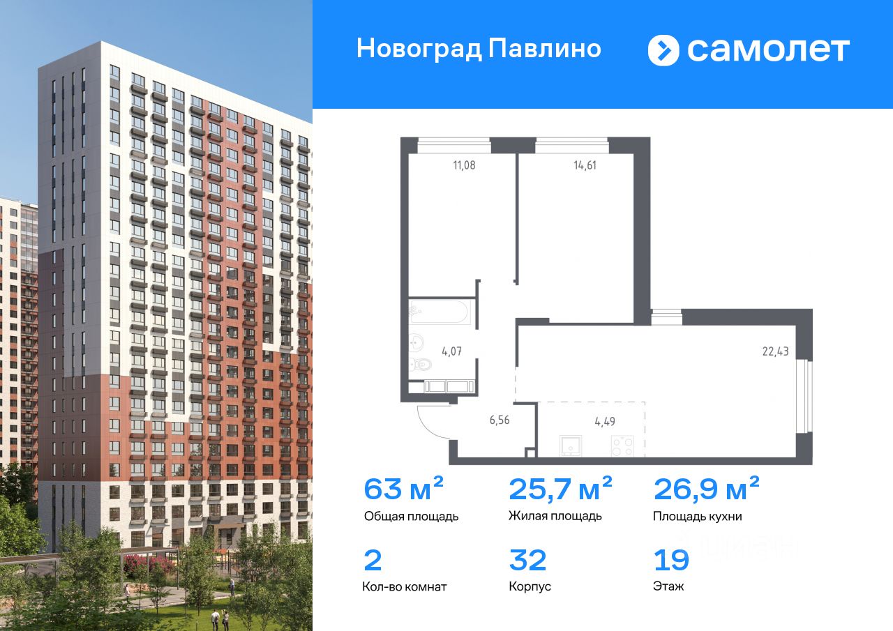 Строим кварталы для жизни с заботой о будущем. Предлагается 2-комнатная квартира комфорт-класса 63 кв.м в корпусе 32 на 19 этаже, в ЖК ''Новоград Павлино''