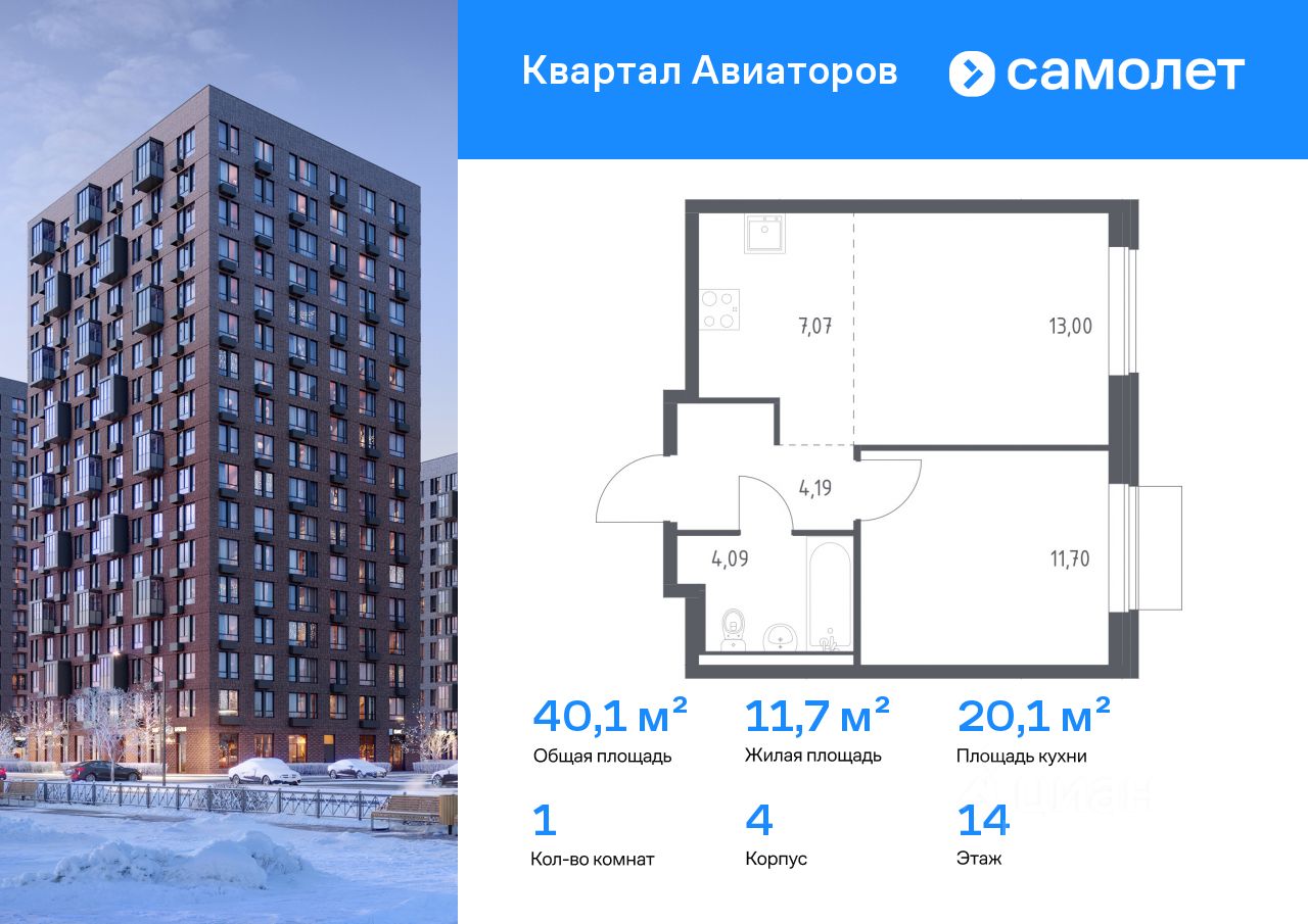Строим кварталы для жизни с заботой о будущем. Предлагается 1-комнатная квартира комфорт-класса 40,05 кв.м в корпусе 4 на 14 этаже, в ЖК ''Квартал Авиаторов'' Квартира с предчистовой отделкой. Доступность дополнительных опций уточняйте у застройщика.